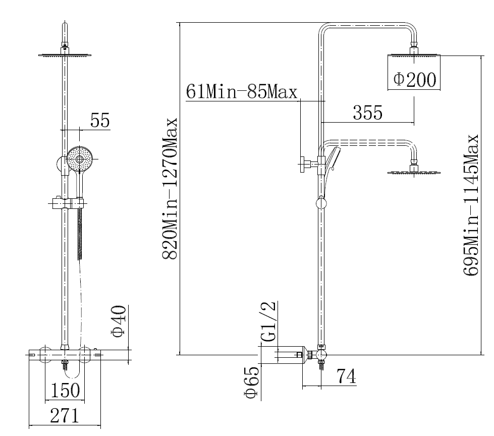 Dual exposed shower in a chrome finish with 3 mode handset and 200mm stainless steel head. this shower has a minimum requirement of 0.5bar pressure