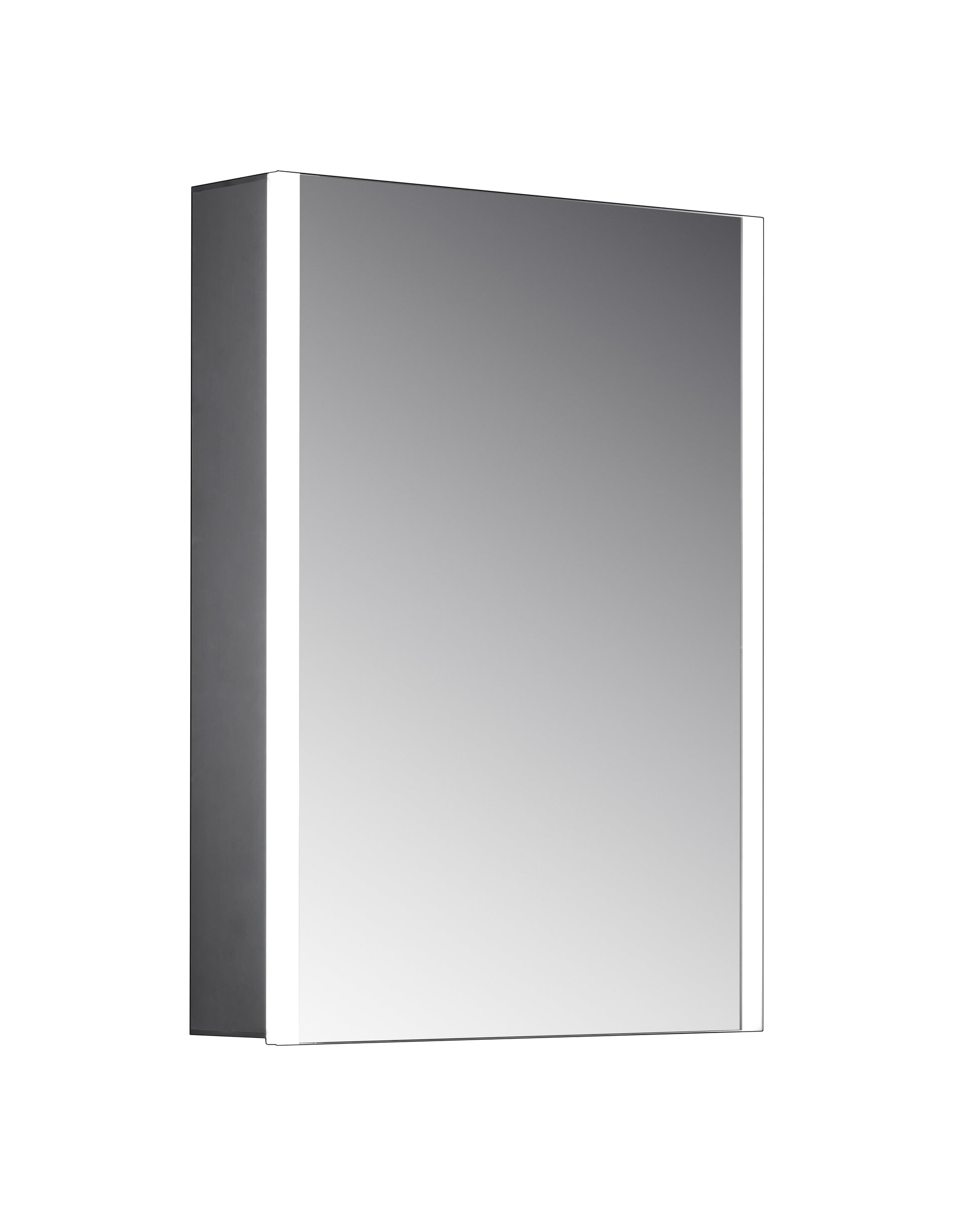 Eden LED single door mirror cabinet with LED strips, sensor switch and shaver socket.